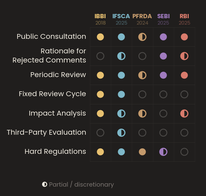 What IBBI has done voluntarily, every financial sector regulator should be required to do by law. Even IBBI, whose earlier leadership pioneered these efforts, has not repeated the exercise since. The model is straightforward: a mandatory, periodic third-party evaluation of each regulator’s rule-making conduct, covering consultation quality, impact assessment rigour, and review compliance, with findings made publicly available.