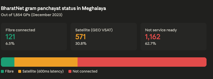 And Meghalaya needs it. According to a parliamentary reply by the Ministry of Communications in December 2022, 2,040 of the state's 5,623 villages, over 36 per cent had no mobile coverage at all. Under BharatNet, the government's flagship programme to connect every gram panchayat with broadband, only 6.5 per cent of Meghalaya's gram panchayats were connected via optical fibre as of 2023, against a national average of roughly 79 per cent. Another 571 GPs are classified as “service ready” on satellite, using older geostationary VSAT links with approximately 600 milliseconds of latency, which BharatNet’s own technical documentation acknowledges is unsuitable for low-latency applications. The remaining 1,162 GPs, 62.7 per cent of the total, are not service ready at all. And where connectivity does exist, it barely works. Digital payment transaction failure rates in the Northeast as a whole are 1.5 to 2 times the national average, driven by three times higher network downtime and 50 per cent slower speeds. Even in urban centres across the region, median wireless download speeds fall below the 20 Mbps threshold that the UN considers the minimum for usable broadband.