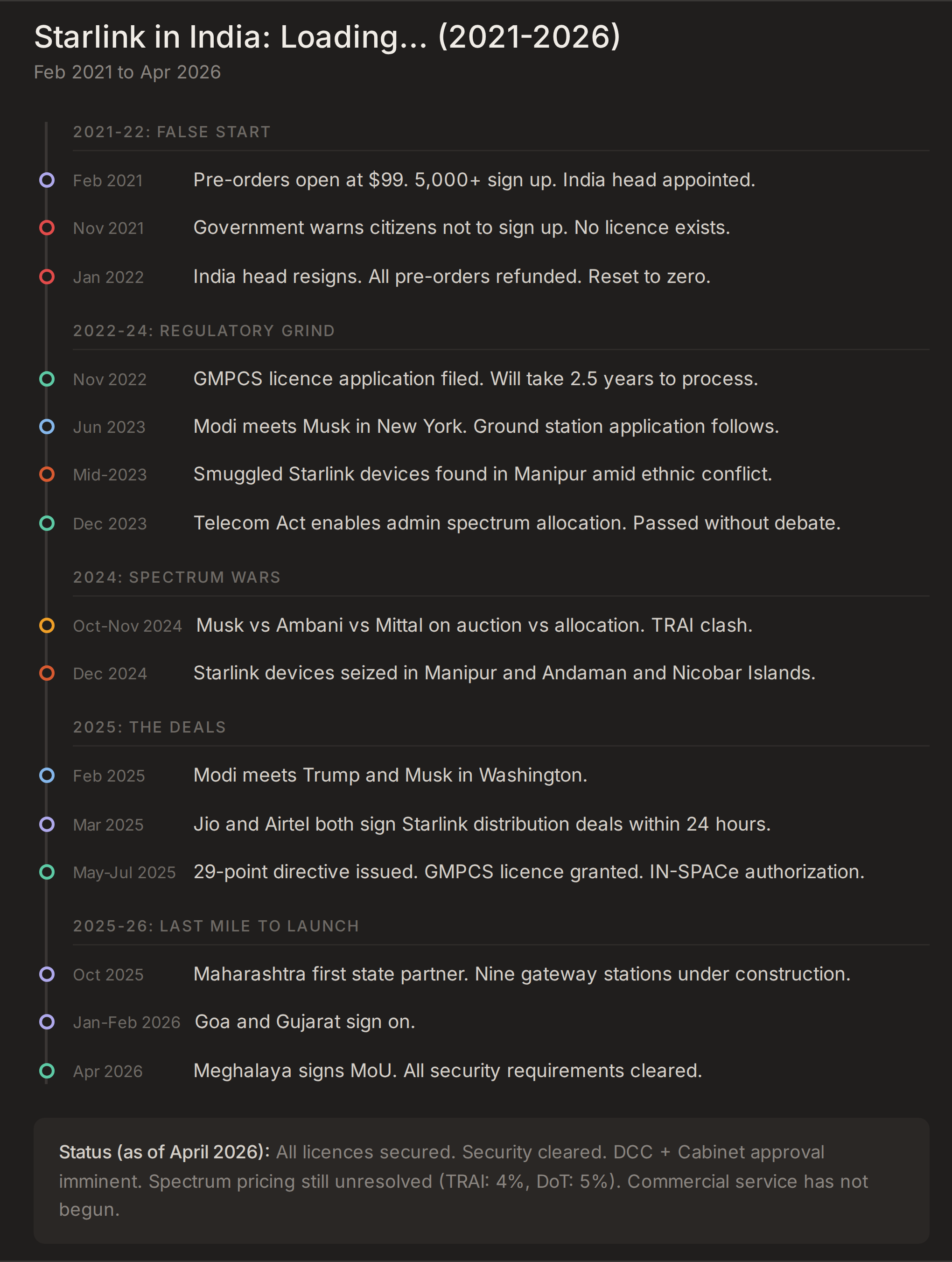 India, to its credit, isn’t taking any chances either. It has adopted a full bomb squad approach, with all protective gear, making one careful snip at a time. Starlink opened pre-orders in February 2021, signed up over 5,000 customers, and set a target of 200,000 terminals by December 2022. Within months, the government issued a public warning asking citizens not to sign up, the country head resigned, and all pre-orders were refunded. The licence application with DoT, which would allow it to offer satellite internet services commercially in India, filed in November 2022, took over two and a half years to process. Along the way, Starlink’s progress required a Modi-Musk meeting in New York, a Modi-Trump-Musk meeting in Washington and a spectrum allocation battle that pitted Ambani and Mittal against Musk before both ended up signing distribution partnership deals with Starlink.